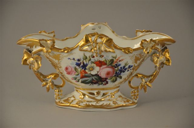 VASE BOUQUETIÈRE de forme ovale en porcelaine polychrome et or à décor de roses, anses en forme de vignes. Milieu XIXème. Haut. 17, Long. 33 cm. (éclat)