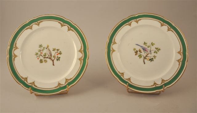PARIS. LAHOCHE. Paire d' ASSIETTES montées en porcelaine blanche polychrome à décor peint d'oiseaux, bandeau vert en bordure. Marque "Palais Royal". XIXème. Diam. 22 cm.