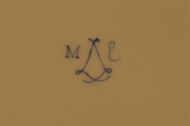 PLAT À MENDIANT en porcelaine polychrome à décor floral et rehaut or. Porte la marque apocryphe de Sèvres et les initiales M.L. Long. 34, Larg. 28 cm.