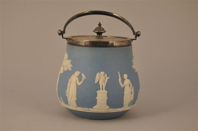 WEDGWOOD. Seau à biscuit, décor à l'antique, cerclage en métal argenté. Diam. 20 cm.