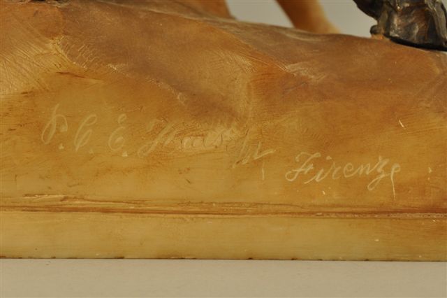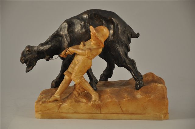 Enfant tirant un mouton. Groupe en albâtre et en bronze à patine brune, porte une étiquette " CABANON, joaillier orfèvre à Montpellier ". Signé P. C. E Fiaschi et situé à Firenze sur la base.