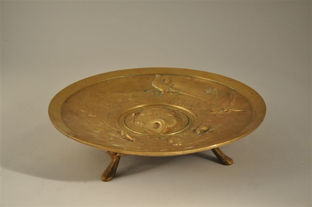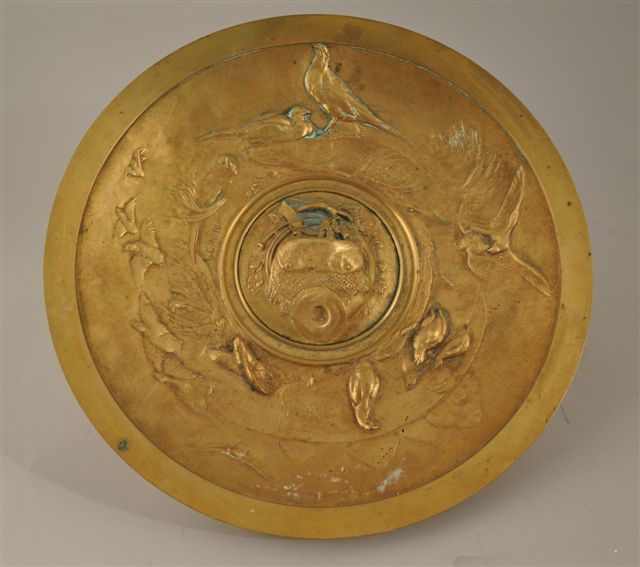 COUPE en bronze doré à décor de trophées de chasse, faisans et perdrix. Signée A. CAIN.