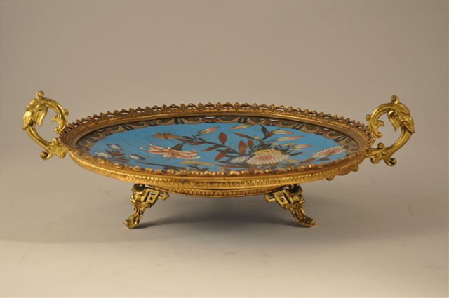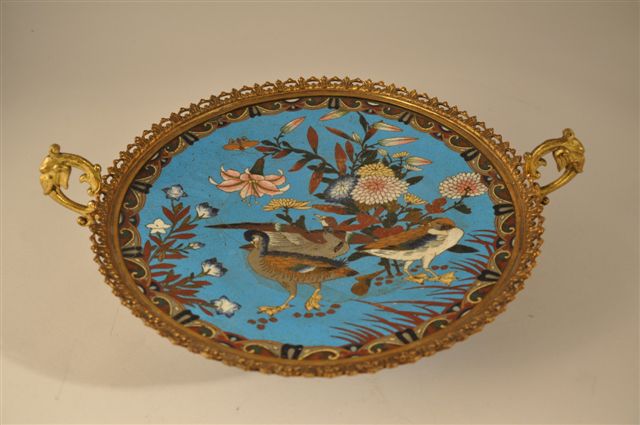 CHINE. GRAND PLAT en émail cloisonné. Décor de canards et de fleurs sur fond bleu. Monture en bronze doré avec deux anses latérales, frises à fleurons stylisés ajourés et feuilles de lauriers, repose sur trois pieds en volutes avec coquilles et têtes de lions. Diam. 33 cm (fêles ).
