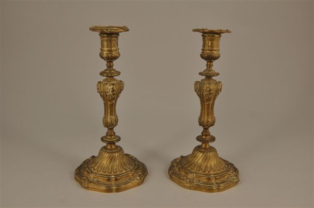 PAIRE de FLAMBEAUX en bronze doré. Le pied circulaire à contours et moulures, en relief, orné de quatre agrafes ciselées de feuilles d'acanthe, l'ombilic creusé de cannelures alternées et spiralées, sous un renflement en forme de bouton, surmonté du fût balustre à pans et côtes, appliqué de feuillage et décor Rocaille, le binet cylindrique cintré à décor de godrons et filets. Style Louis XV. Haut. 25 cm.