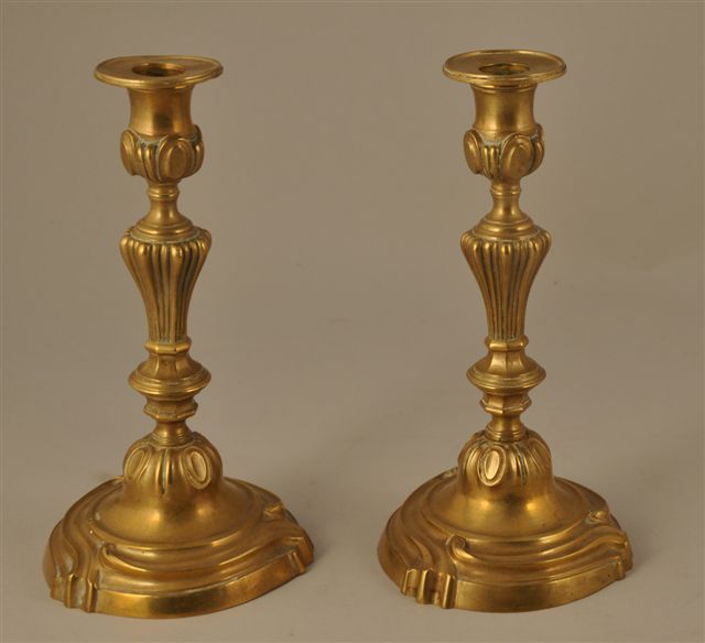 Paire de BOUGEOIRS en bronze, base circulaire à décor mouvementé, l'ombilic orné de médaillon, le fût godronné, le binet tourné alternant motifs de godrons et de médaillons. Style Louis XV, XIXème. Haut. 24,5 cm.