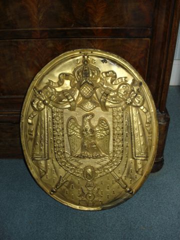 PANONCEAU d'Officier ministériel en tôle de fer repoussé redoré aux armes de Napoléon III. L.G. 44 x 35 cm.