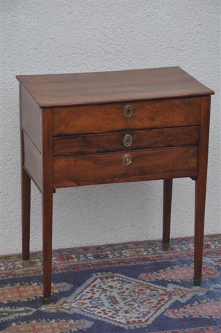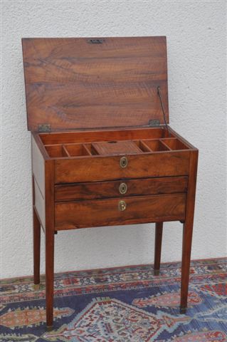 TRAVAILLEUSE en noyer. Elle ouvre à un abattant dévoilant quatre casiers et une niche centrale couverte, et 2 tiroirs en façade. Elle repose sur quatre pieds gaine terminés par des sabots de laiton. XIXème.