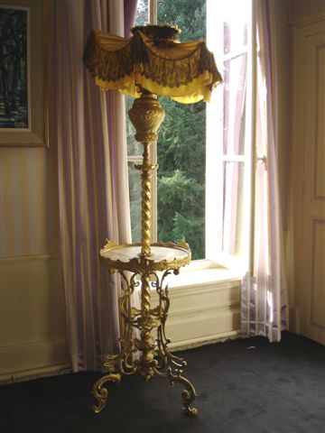 LAMPE DE PARQUET constitué d'une lampe à pétrole montée sur un guéridon tripode. Bronze doré et onyx. Napoléon III, fin XIXème - début XXème.