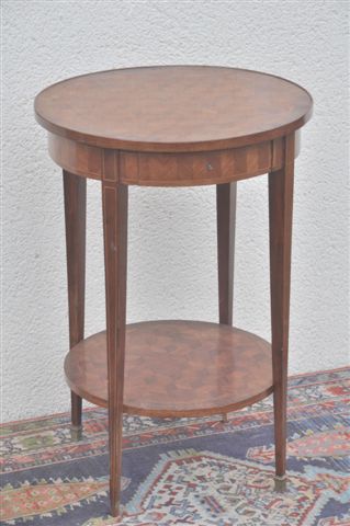 Petit GUÉRIDON de salon en placage d'acajou et et marqueterie de losanges. Il repose sur quatre pieds gaine terminés par des sabots en laiton (manque et éclats au placage).