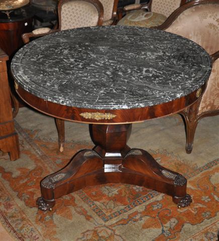 GUÉRIDON de salon en acajou et placage d'acajou. Piètement balustre à pans coupés, reposant sur un piètement tripode se terminant par des griffes de lion. Ornementations de rosaces et palmettes stylisées en bronze sur le bandeau de la table et le piètement. Roulettes.