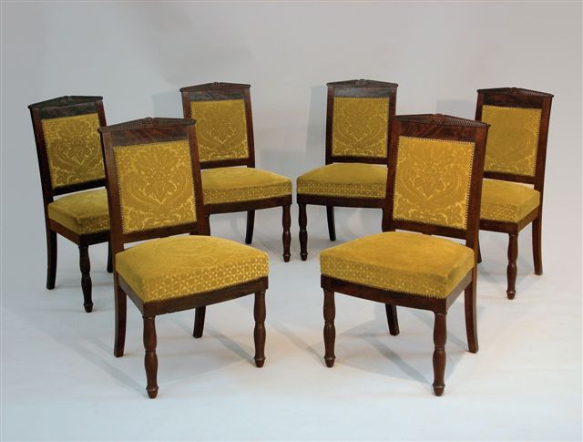 SUITE de SIX CHAISES en acajou. Dossier droit sculpté d'enroulements. Piètement postérieur en sabre et antérieur à renflements. Restauration, XIXème.