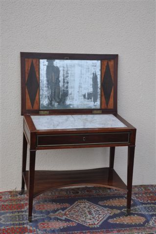 COIFFEUSE D'HOMME en acajou et placage d'acajou. Elle ouvre à un abattant dévoilant une glace dans des encadrements marquetés de losanges. Plateau de marbre gris sainte-Anne. Un tiroir en ceinture dévoilant trois casiers. Elle repose sur quatre pieds gaine réunis par une tablette d'entretoise concave et terminés par des roulettes (postérieures). Ornementation de laiton doré. (éclats et manques). Louis XVI. Fin du XVIIIème siècle. Haut. 76, Larg. 84, Prof. 52 cm.