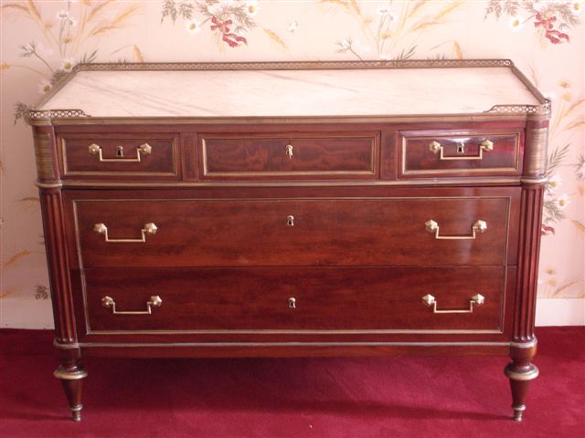 COMMODE en acajou ouvrant à trois rangs de tiroirs dont trois dans la rangée supérieure, et deux inférieurs sans traverses. Il repose sur quatre pieds toupies. Montants à cannelures, piètement toupie. Dessus marbre blanc veiné. Galerie lingotière ajourée sur le dessus, grattoir, prises de mains et filets de bronze. Entrées de serrures à trèfles.