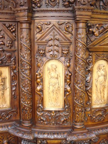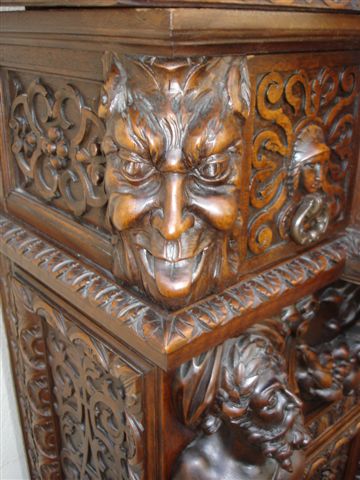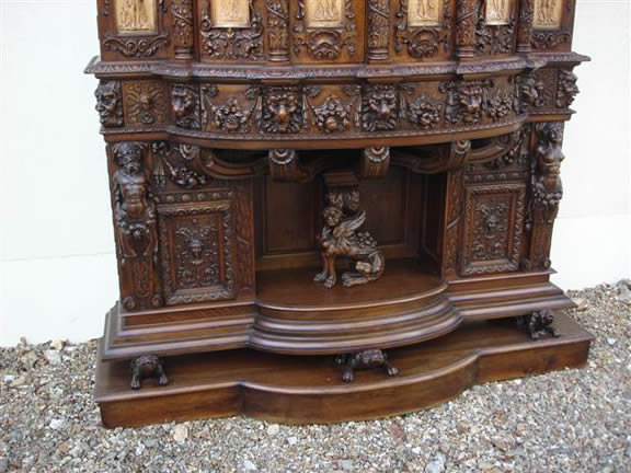 - La partie inférieure surmontée de quatre tiroirs sculptés de têtes de lions, mascarons, guirlandes de fruits retenues et têtes de femmes. Montants à tête de vieillards se terminant en gaine. Les panneaux sont travaillés en relief de grotesques, feuilles d'eau, de laurier et frise d'oves stylisées. La base cintrée repose sur trois pieds zoomorphes. Style Renaissance. Seconde moitié du XIXème siècle.