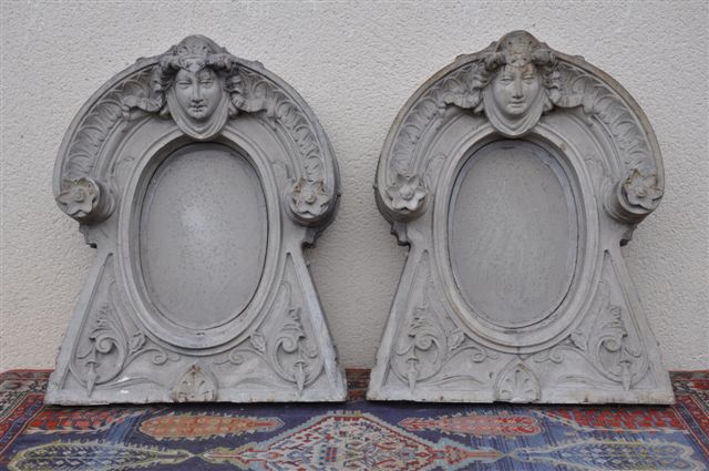 Paire de LUCARNES à la Mansart en plomb et zinc. Riche décor du XVIIème: têtes de femmes, acanthes, feuilles d'eau encadrent un médaillon ovale.