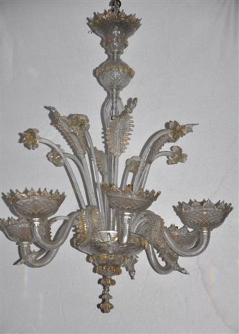 LUSTRE à 6 bras de lumières en verre de Venise à décor de pointes de diamant et applications pincées sur le corps, éléments feuillagés. Dans le goût de la Régence, Murano, XXème siècle.