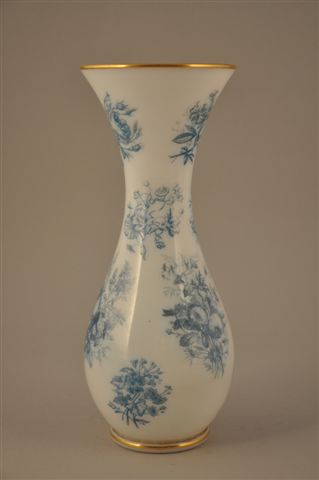 VASE balustre en verre opalin blanc à décor d'anémones, giroflées et roses fleuries. Filet or. Charles X. XIXème siècle. Haut. 30 cm.