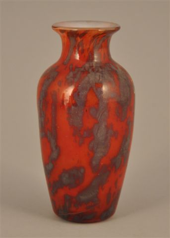 Charles SCHNEIDER (1881-1953). VASE ovoïde en verre soufflé moulé, nuagé de poudres intercalaires argent sur fond rouge orangé. Première moitié du XXème siècle. Signé. Haut. 15 cm.