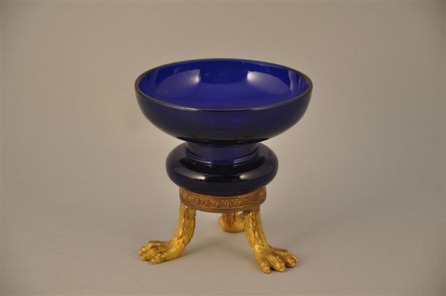COUPE en verre bleu sur piédouche, monture en bronze doré à trois griffes.