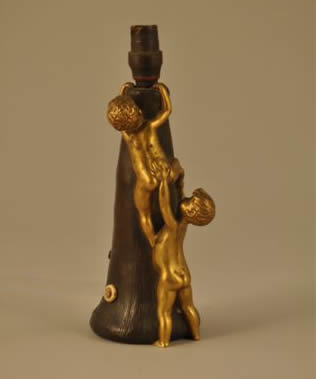 PIED DE LAMPE en bronze patiné et doré à décor de jeunes enfants escaladant un arbre. Porte une trace de signature à la base "F. SE. LE". Début du XXème siècle. Haut. 16 cm.