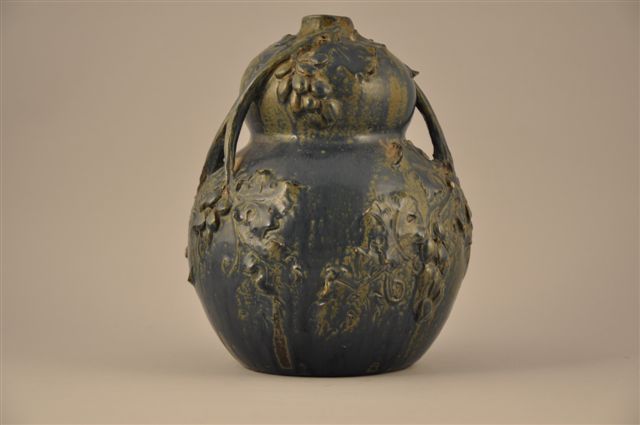 VASE de forme calebasse en grès, engobe bleu et vert, à décor en relief de pampres de vigne, formant deux anses latérales. Signé F. RAMION (?). Haut. 25 cm. (petits éclats).