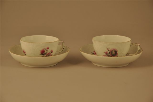 PAIRE de TASSES et SOUS-TASSES en porcelaine allemande, à décor floral en camaïeu pourpre.