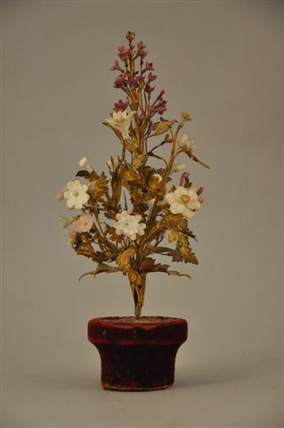 BOUQUET FLEURI, fleurs en porcelaine blanche et teintée pourpre sur branchage en métal doré, scellé dans un pot recouvert de velours rouge. XIXème. 30 x 13 cm. (quelques petits accidents).