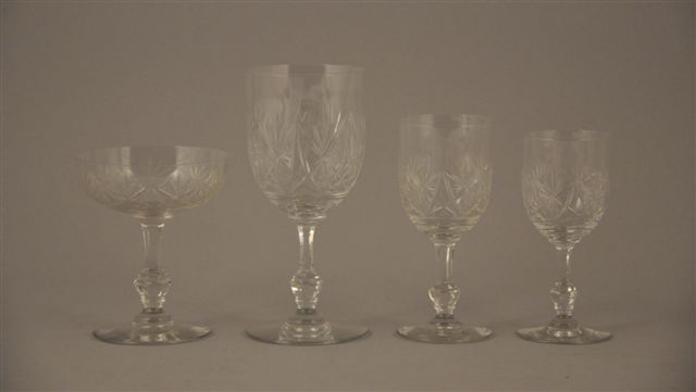 Partie de SERVICE DE VERRES en cristal taillé, 31 pièces, pied à pans, la paraison à motifs géométriques étoilés, comprenant quatre verres à eau, sept verres à vin, onze verres à Porto et neuf coupes à champagne.