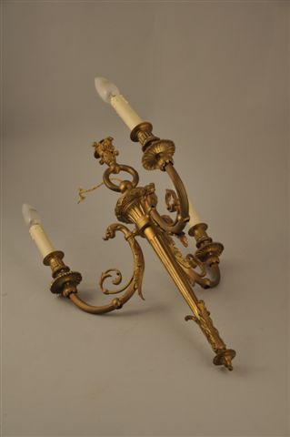 LUSTRE en bronze à trois lumières, les bras en volutes, motifs de feuilles d'acanthe, couronne de lauriers. Style Louis XVI.