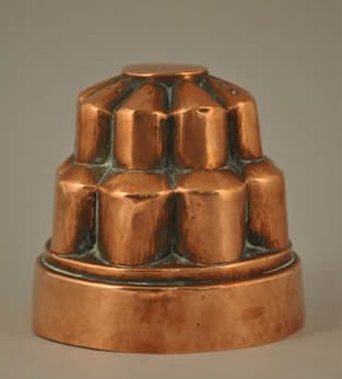 MOULE À GÂTEAU en cuivre, à motifs tronqués sur deux niveaux. Haut. 15 cm. (petit choc).