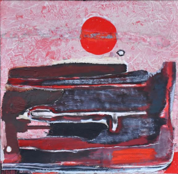 Pierre GRIMM Soleil rouge.Technique mixte et collage sur carton, signée...