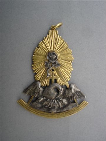 BIJOU MAÇONNIQUE de chevalier ROSE-CROIX en bronze doré et métal argenté, décoré d'un compas orné de rayons, Rose-Croix et pélican nourrissant de son sang ses petits. Avec son anneau.