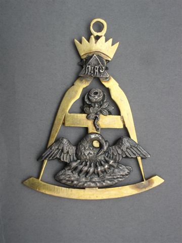 BIJOU MAÇONNIQUE de chevalier ROSE-CROIX en bronze doré et métal argenté, décoré d'un compas ciselé d'une Rose-Croix et d'un pélican nourrissant de son sang ses petits. Surmonté du Delta hébraïque et d'une couronne stylisée avec son anneau.