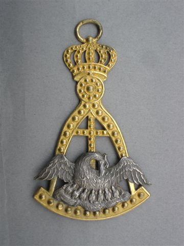 BIJOU MAÇONNIQUE de chevalier ROSE-CROIX en bronze doré et métal argenté, décoré d'un compas ciselé de petites boules et d'un pélican nourrissant de son sang ses petits. Surmonté d'une couronne fermée. Avec son anneau.