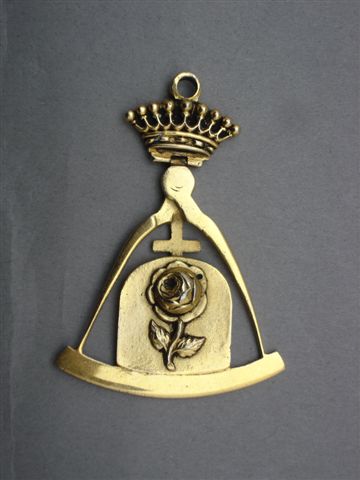 BIJOU MAÇONNIQUE de chevalier ROSE-CROIX en bronze doré, décoré d'un compas, Rose-Croix et pélican nourrissant de son sang ses petits. Surmonté d'une couronne comtale. Avec son anneau.