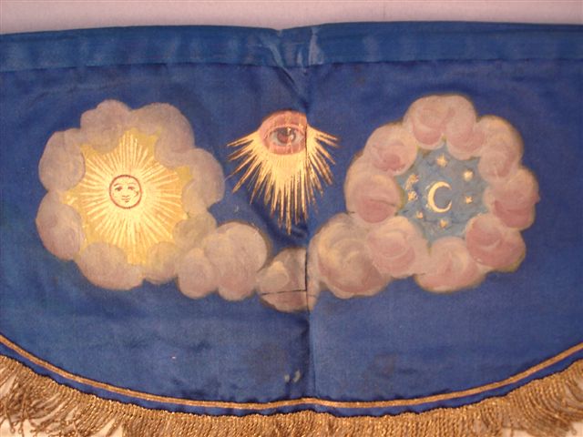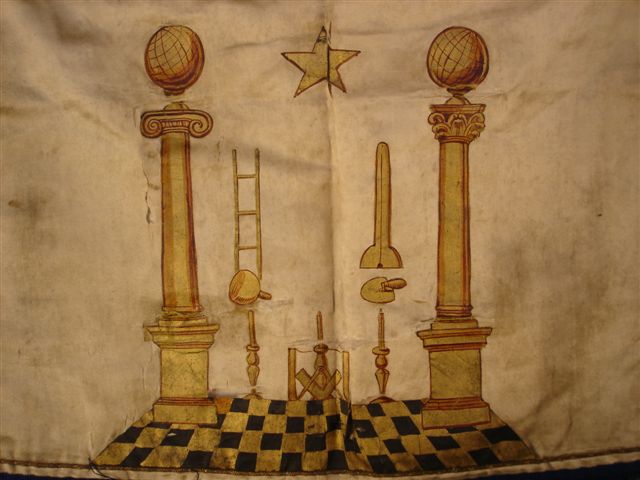 TABLIER de MAÎTRE en soie crème peinte à décor du pavé mosaïque et de deux colonnes, l'une à chapiteau ionique, l'autre à chapiteau corinthien, surmontées de deux globes. Les outils et les symboles maçonniques - équerre, compas, candélabres, truelle, maillet, échelle, étoile et levier - sont disposés entre les deux colonnes. Sur le faux rabat à fond bleu et franges dorées, figurent le soleil, l'Oeil qui voit tout et la lune. Cordon de taille.