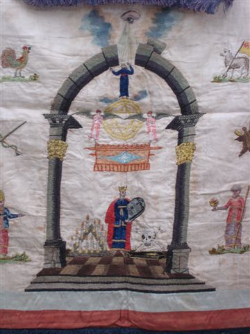TABLIER du ROYAL ARCH en soie. Décor polychrome finement brodé. Au centre d'un temple orné de deux colonnes, figurent l'Arche d'Alliance, les Chérubins et Zorobabel. L'Oeil qui voit tout surplombe la scène. De part et d'autre, sont disposés les symboles de l'Agneau, et les outils maçonniques. Au sommet de la composition, sur le faux rabat, sous un soleil rayonnant, une devise a été brodée: "SIT LUX ET LUX FUIT" (que la lumière soit et la lumière fut). Cordon de taille.