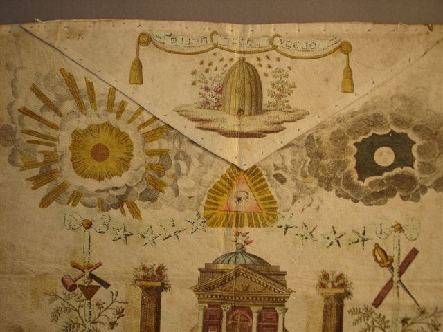 TABLIER de MAÎTRE en peau à décor imprimé et peint. Au centre, sur le pavé mosaïque, un temple entouré de deux colonnes surmontées de grenades éclatées. Les outils maçonniques figurent de part et d'autre avec le fil à plomb. Une guirlande d'étoiles relie le soleil, le Delta centré de l'Oeil et la lune. Sur le faux rabat, une ruche, rameaux fleuris et inscriptions. Sous le faux rabat, figure une mention imprimée: "Deposé à la Bibliothèque Imp.le".