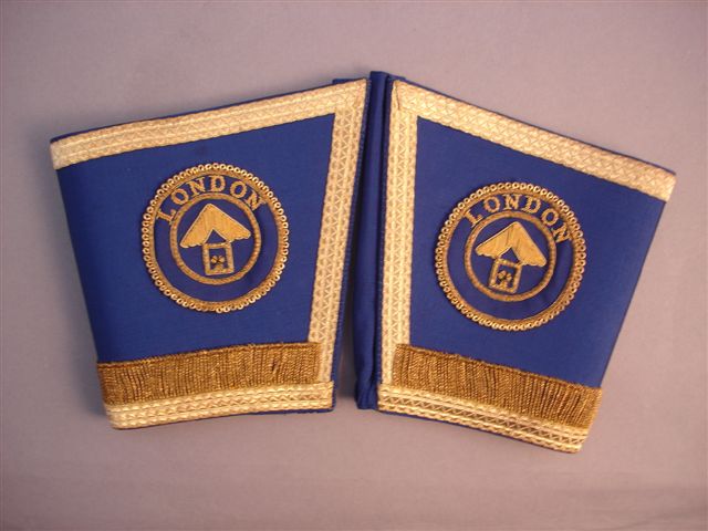 2 - PAIRE de MANCHETTES en satin bleu, fil doré, galons et franges. Marquées "LONDON" dans un médaillon circulaire à décor du compas et de l'équerre. XXème.