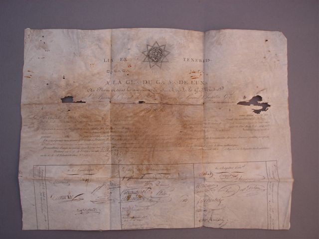 DIPLÔME d'ADMISSION au GRAND ORIENT de FRANCE à Paris, en date du 3 janvier 1813, au nom de Laurent-Joseph BOURRIOT, né le 10 août 1760, n°6810. Parchemin. (pliures, manques et déchirures).