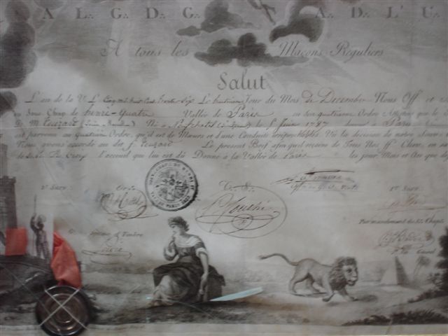DIPLÔME de ROSE-CROIX décerné à Louis Marcellin TOUZARD, né le 5 juin 1787, par la Souveraine Chapelle de Henri IV à Paris. Porte les signatures des membres de la Chapelle dont celles du secrétaire général et du garde des Sceaux. (pliures et déchirure en bas à droite). Dans un cadre (verre accidenté).