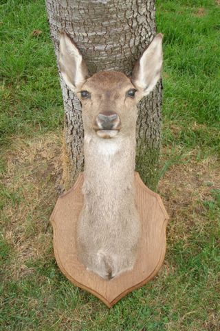 Tête de BICHE naturalisée, fixée sur un écusson en bois.