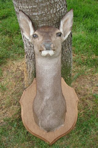 Tête de BICHE naturalisée, fixée sur un écusson en bois.