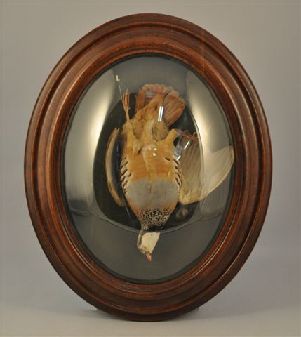 PERDRIX rouge et SARCELLE d'hiver mâle naturalisés, dans deux cadres ovales en bois mouluré, formants pendants, verre bombé. 58 x 47 cm.