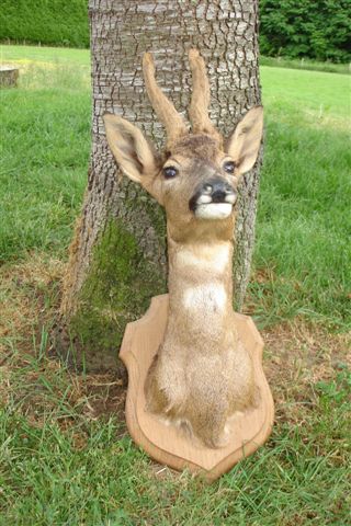 Tête de jeune CERVIDÉ aux bois de velours naturalisée, fixée sur un écusson en bois.