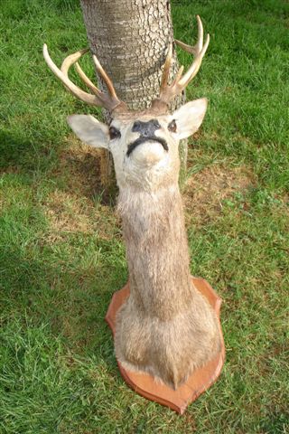 Tête de CERF naturalisée, fixée sur un écusson en bois.