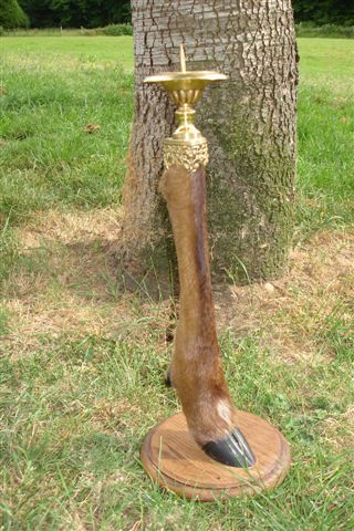 Pied de cervidé monté en PIQUE-CIERGE, sur un socle en bois.