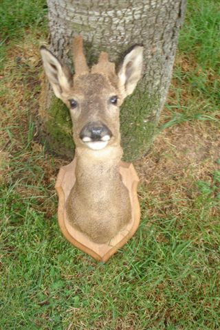 Tête "BIZARDE" de jeune cervidé naturalisée, fixée sur un écusson en bois.