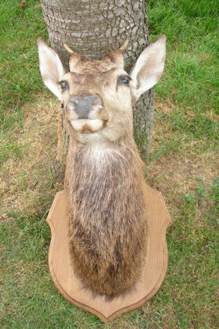 Tête de jeune CERF naturalisée, fixée sur un écusson en bois.