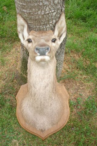 Tête de CERVIDÉ naturalisée, fixée sur un écusson en bois.